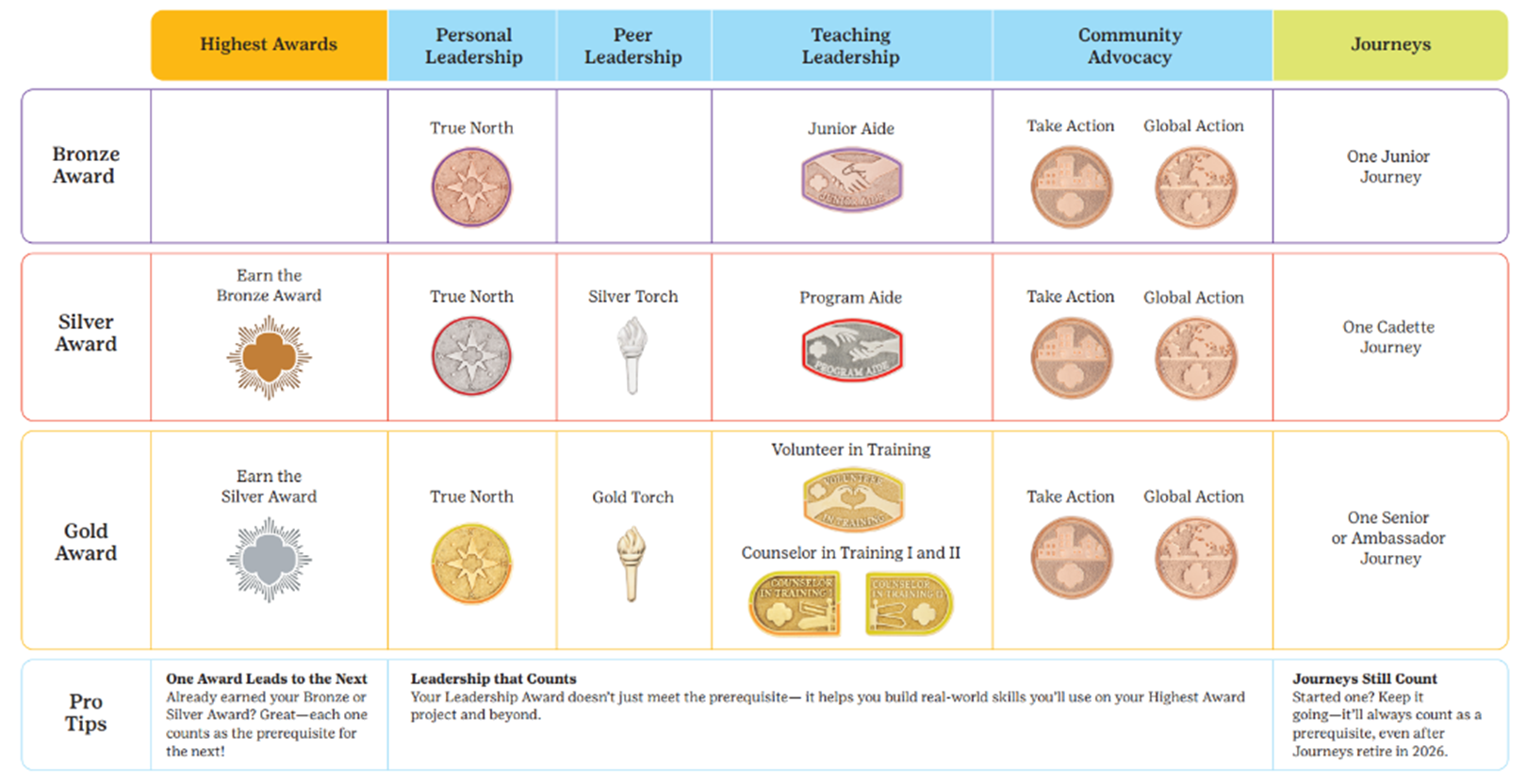 Great news! Girl Scouts now only need to complete one prerequisite before starting their Bronze Award: either a Junior Leadership Award or a Junior Journey (including its Take Action project). Journeys will be retired in October 2026, but if you complete one before then, it will still count toward your Gold Award. See the chart below!